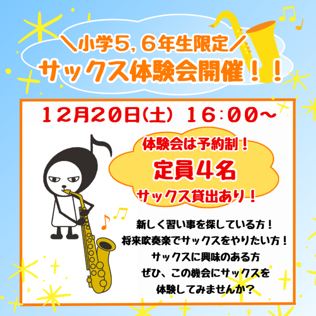 小学5,6年生限定サックス体験会開催のお知らせ