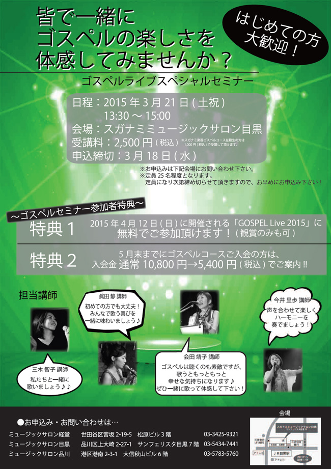 来る3月21日(土祝)、スガナミミュージックサロン目黒において【ゴスペルライブスペシャルセミナー】が開催されます。