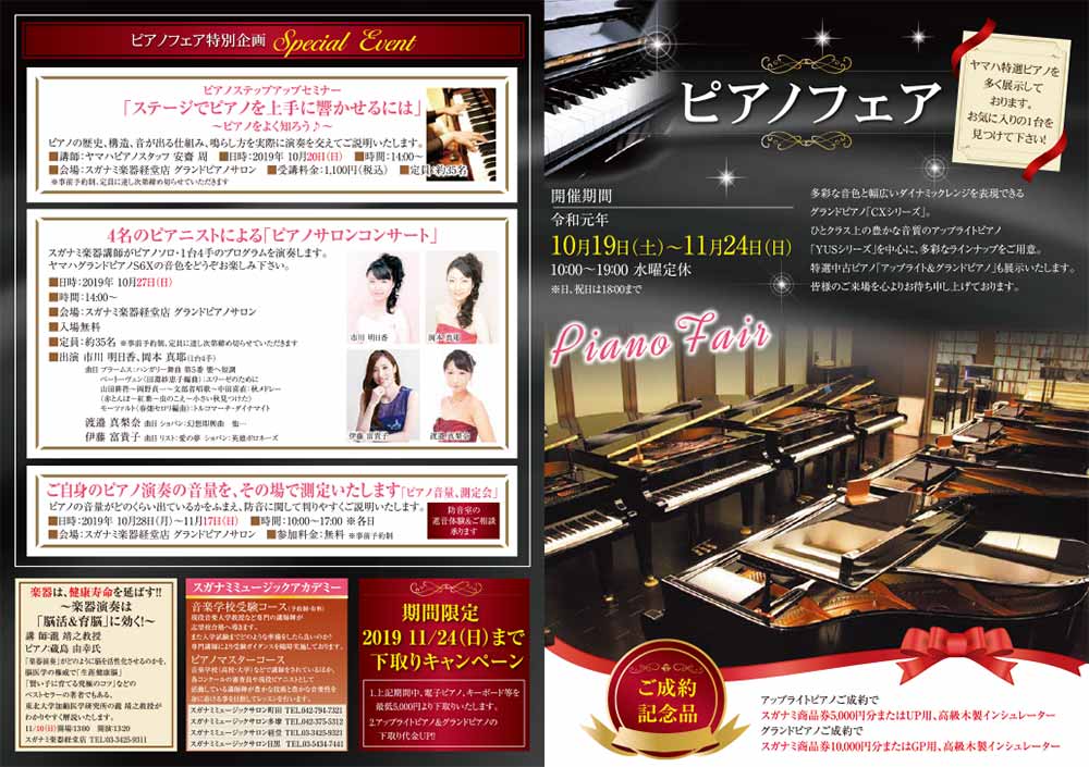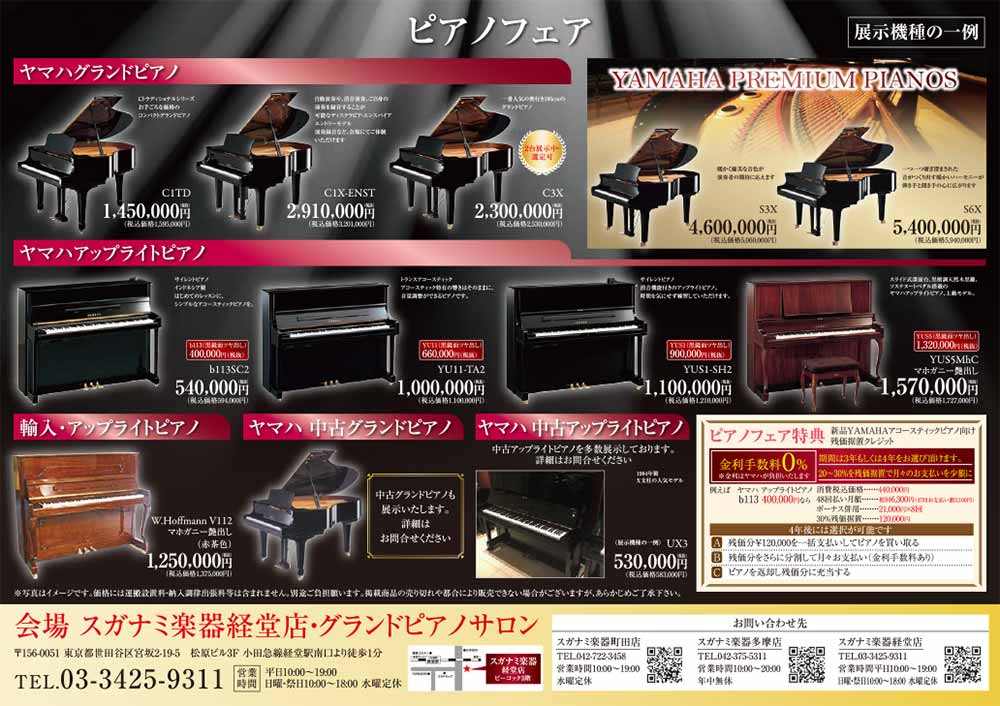 スガナミ楽器講師がピアノソロ・1台4手のプログラムを演奏します。ヤマハグランドピアノS6Xの音色をどうぞお楽しみ下さい。