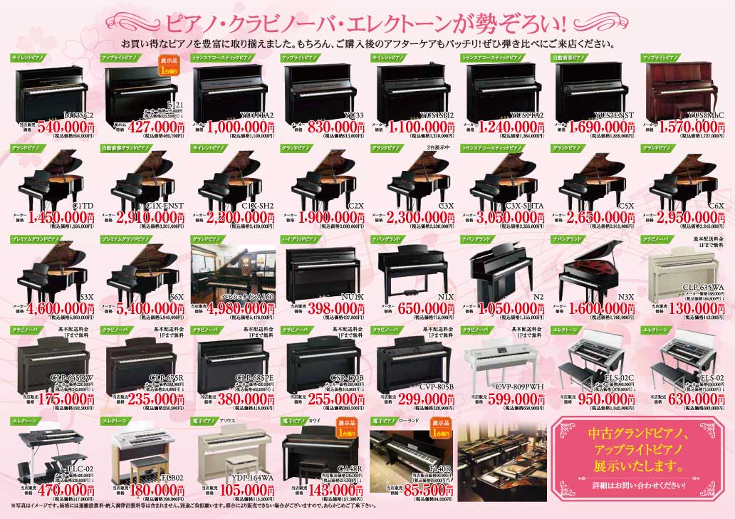 グランドピアノ・アップライトピアノ・クラビノーバ・エレクトーンが勢ぞろい!お買い得なピアノを豊富に取り揃えました。もちろんご購入後のアフターケアもばっちり!ぜひ聞き比べにご来店下さい。