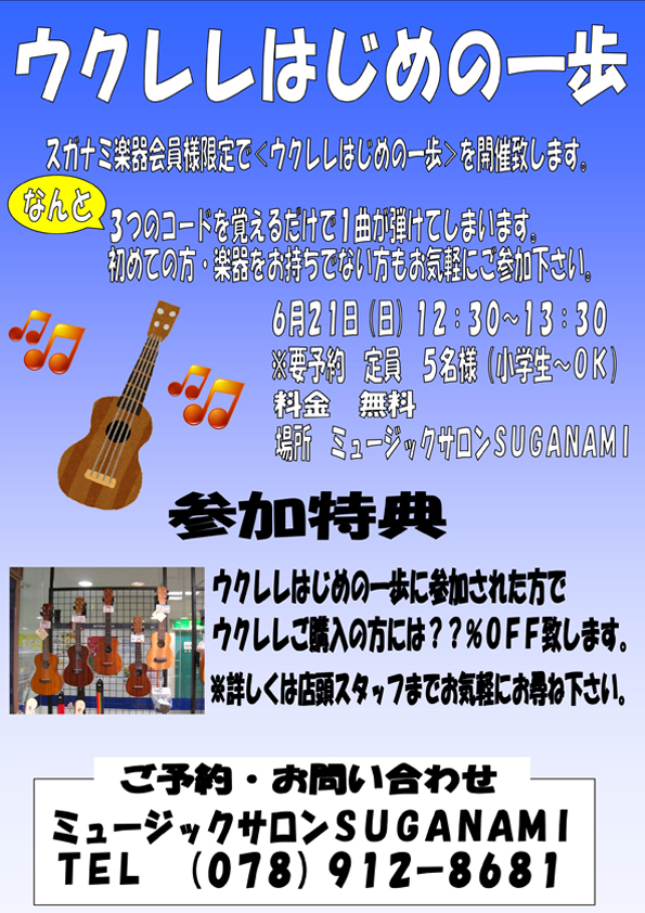 2015-06-06 update ウクレレはじめの一歩 スガナミ楽器会員様限定開催! 3つのコードを覚えるだけで1曲が弾けてしまいます。初めての方・楽器をお持ちでない方もお気軽にご参加下さい。 ・定員5名様(小学生~OK)※要予約・料金:無料 日程2015年6月21日(日) 時間12:30~13:30 場所ミュージックサロンSUGANAMI 一覧へ戻る