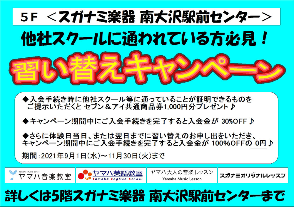 ◆さらに体験日当日、または翌日までに習い替えのお申し出をいただき、キャンペーン期間中にご入会手続きを完了すると入会金が 100%OFFの 0円♪