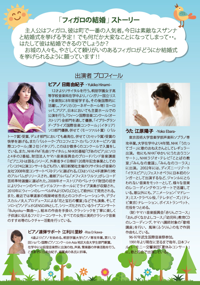 おうたに江原陽子さん、ピアノに日南由紀子さんを迎え、モーツァルトのオペラ「フィガロの結婚」を中心に、オペラの名曲が楽しめます!