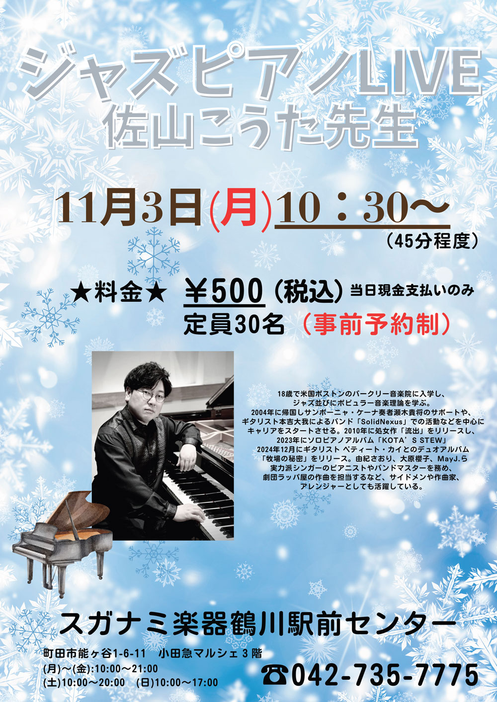 鶴川駅前センターで講師を講師をしている ジャズピアニスト 佐山こうた によるジャズピアノライブを開催します。