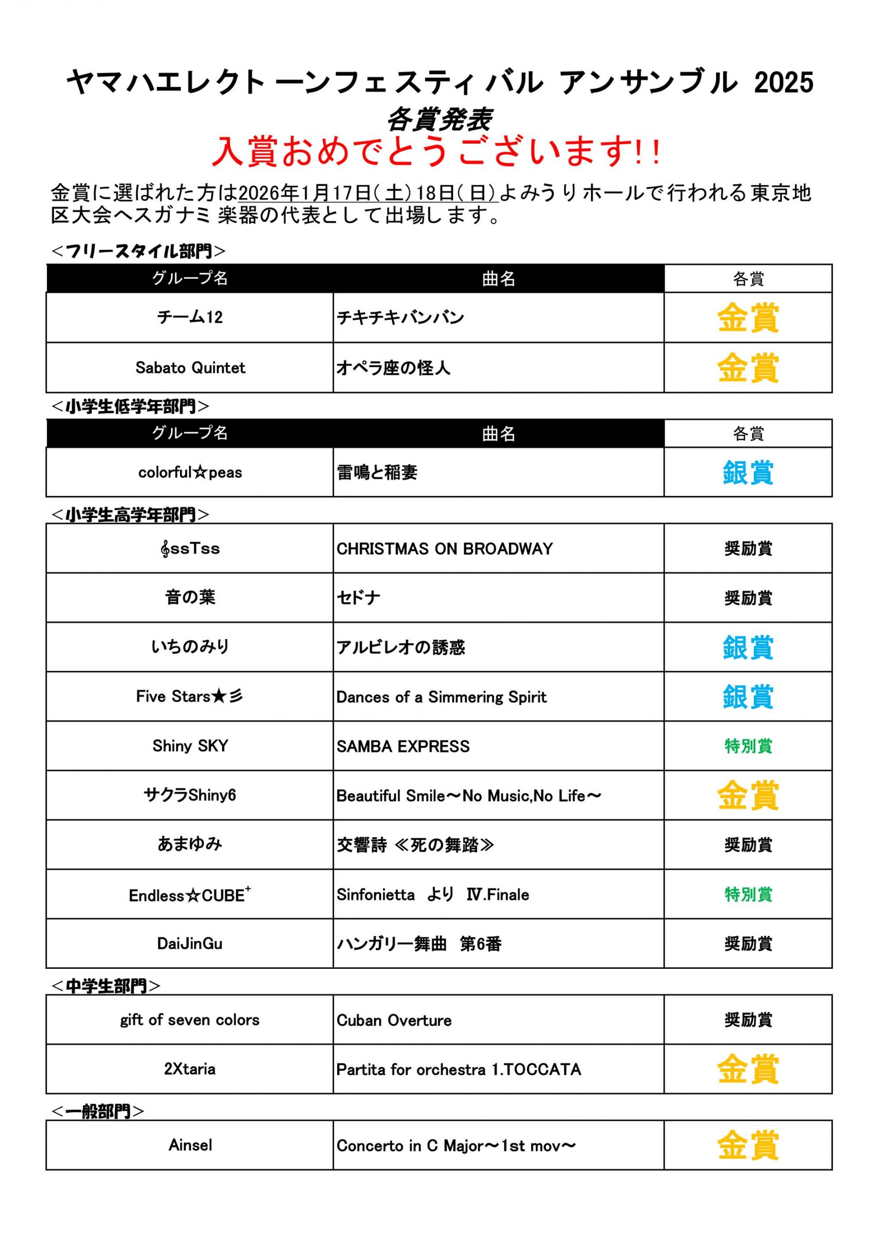 2025-10-20 update ヤマハエレクトーンフェスティバル アンサンブル 2025(町田・多摩) 2025年10月19日(日) フリースタイル部門・コンテスト部門 各賞発表 入賞おめでとうございます!! 日程2025年10月19日(日) 一覧へ戻る