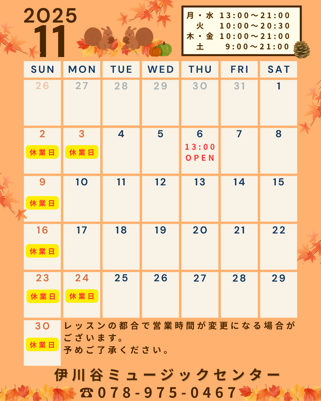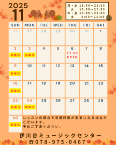2025-10-29 update 11月営業日のお知らせ 11月は画像の通り営業いたします。 レッスンの都合で営業時間が急遽変更になる場合もございます。予めご了承ください。 また、午前中お越しになる際は、予めお電話頂けますと安心してお越し頂けます。 不明点等ございましたら、お気軽にお問い合わせください。 宜しくお願いいたします スガナミ楽器 伊川谷ミュージックセンター ☎078-975-0467 前へ 1 2 3 4 5 6 7 次へ