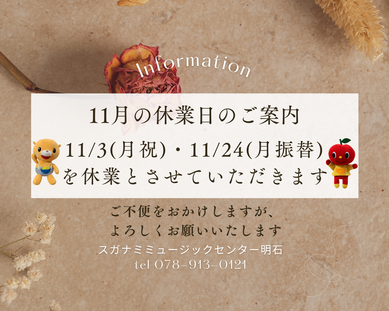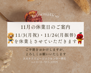 2025-11-01 update 11月の休業日のご案内 11/3(月・祝)・11/24(月・振替休日)を休業とさせていただきます。 ご不便をおかけしますが、ご了承の程よろしくお願いいたします。 スガナミミュージックセンター明石 TEL 078-913-0121 1 2 3 4 5 6 7 次へ