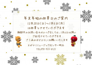 2025-12-01 update 年末年始の休業日のご案内 年末年始の休業日のご案内 12月28日(日)~1月5日(月)は休業とさせていただきます。 期間中のお問い合わせにつきましては、1月6日以降にご返信させていただきます ご了承のほどよろしくお願いいたします スガナミミュージックセンター明石 TEL078-913-0121 1 2 3 4 5 6 7 次へ