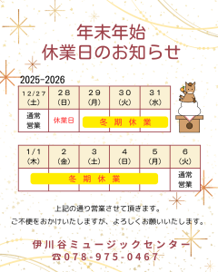 2025-12-15 update 年末年始休業のお知らせ 年末年始の営業は、下記の通りとなります。 2025年12月28日(日)~2026年1月5日(月)まで休業とさせていただきます。 尚、1月6日(火)からは、通常通り営業いたします。 ご不便をお掛けいたしますが、ご理解のほどお願いいたします。 来年もどうぞよろしくお願いいたします。 スガナミ楽器 伊川谷ミュージックセンター ☎078-975-0467 前へ 1 2 3 4 5 6 7 次へ