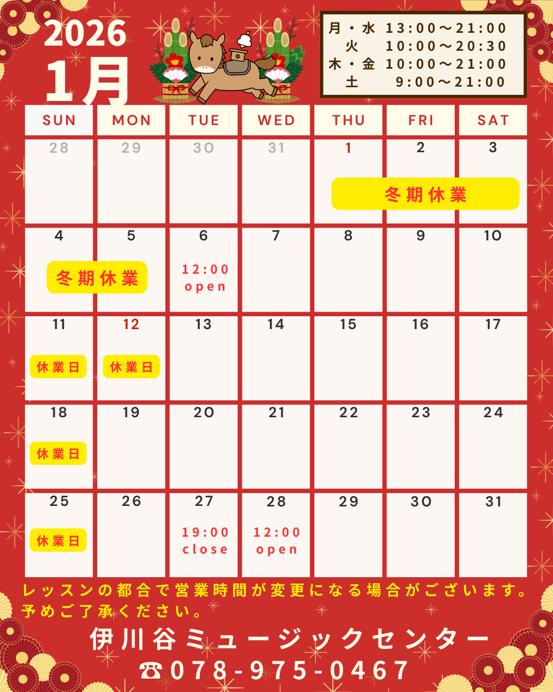 2025-12-27 update 2026年1月営業日のお知らせ 1月は画像の通り営業いたします 尚先日もお知らせいたしましたが、12月28日(日)~2026年1月5日(月)までは、冬期休業となります。 休業期間中にお問い合わせ頂いた内容は、休業明け6日(火)のご連絡となりますので予めご了承ください。 上記の期間ご不便をお掛けいたしますがよろしくお願いいたします。 レッスンの都合で営業時間が急遽変更になる場合もございます。 予めご了承ください。 来年も伊川谷ミュージックセンターをよろしくお願いいたします! スガナミ楽器 伊川谷ミュージックセンター 1 2 3 4 5 6 7 次へ