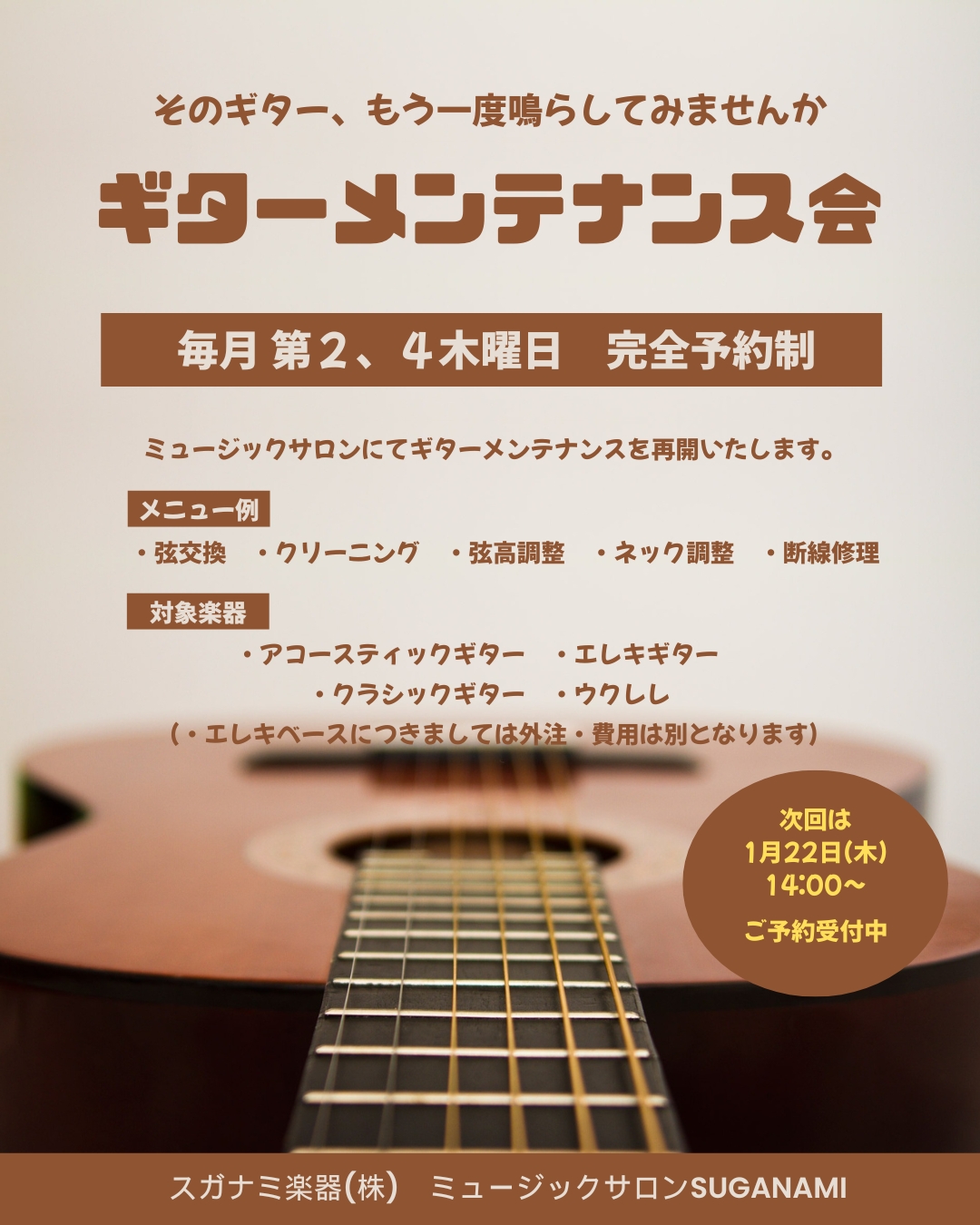 長らくお休みしていた弦交換等の「ギターメンテナンス」を再開します