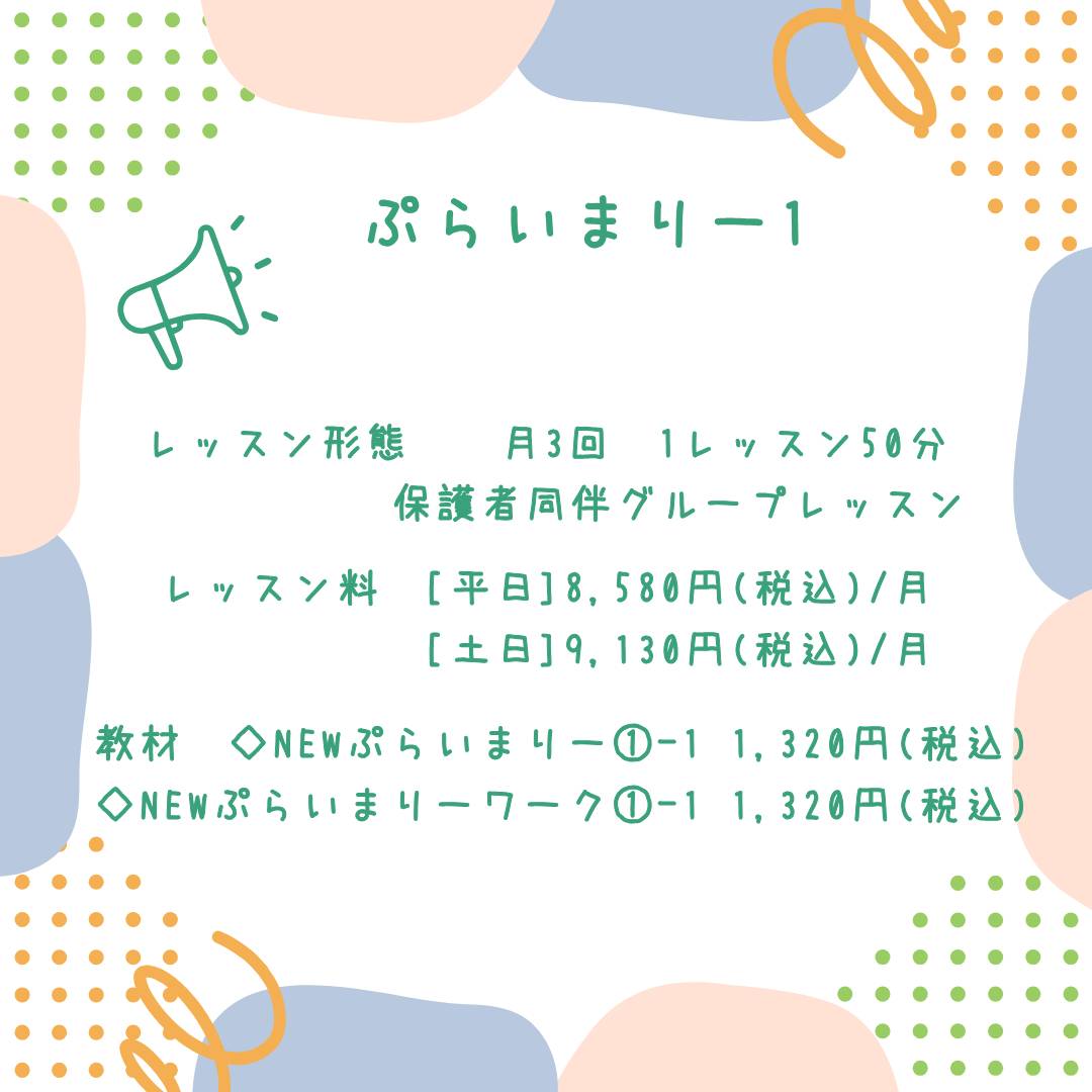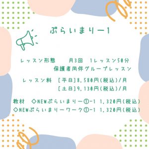 2026-03-19 update ぷらいまりー1 《2026年5月開講予定》 2026年5月から開講予定クラスのおともだち募集中です。 ぷらいまりー1【2022.4.2~2023.4.1生まれの方と保護者様】 《開講曜日》 月曜日 14:30 火曜日 15:00 水曜日 15:00 木曜日 16:30 金曜日 15:30 【3月の体験レッスン日】 27日(金) 15:30 【4月の体験レッスン日】 8日14:15/14日(火)16:15/15日(水)14:15/17日(金)15:30/20日(月)14:00 体験レッスンご予約受付中♪ お問い合わせはこちら 1 2 3 4 5 6 7 次へ