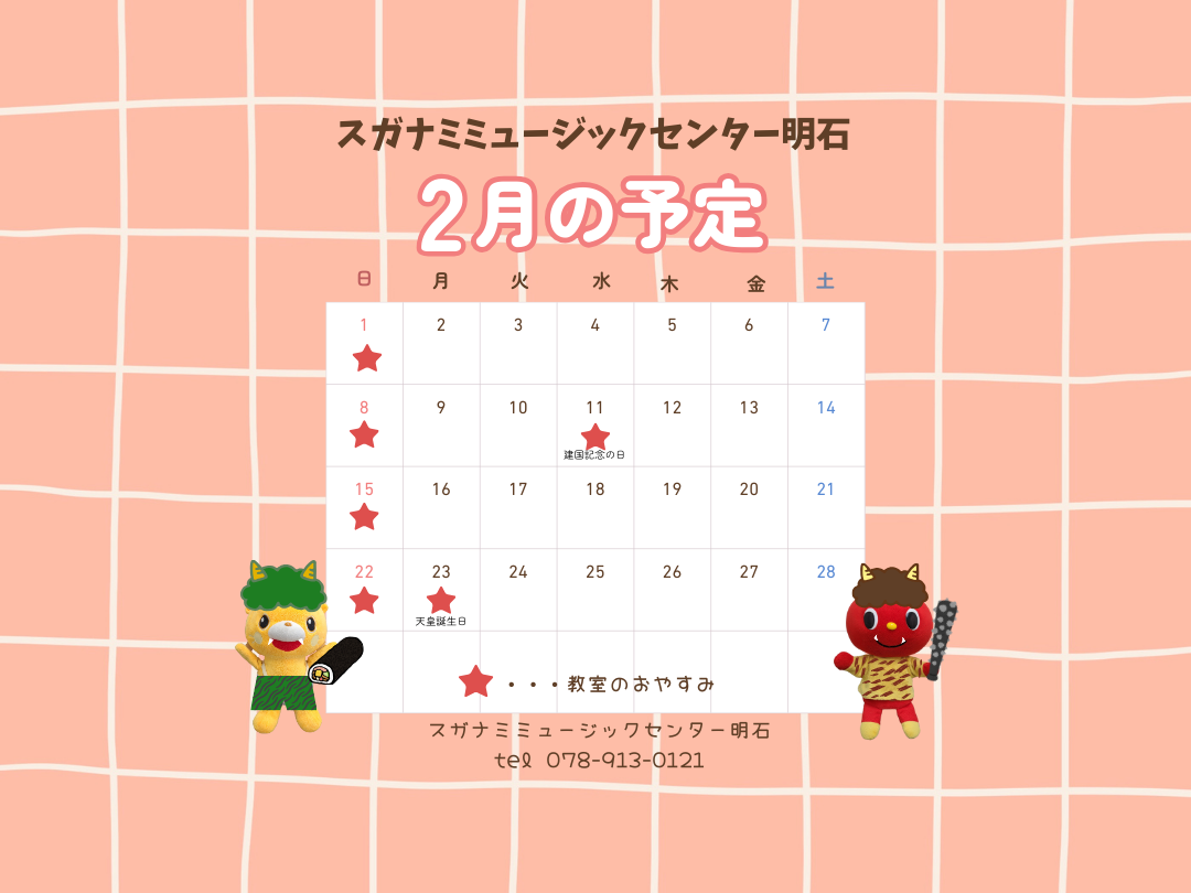 2026-02-03 update 2月の休業日のご案内 2月11日(水、祝日)、23日(月、祝日)は休業とさせていただきます。 ご不便をおかけしますが、ご了承のほど、よろしくお願いいたします。 ※日曜日は定休日となっております スガナミミュージックセンター明石 tel(078)913-0121 お問い合わせ可能時間 月~土 10:00~17:30 前へ 1 2 3 4 5 6 7 次へ