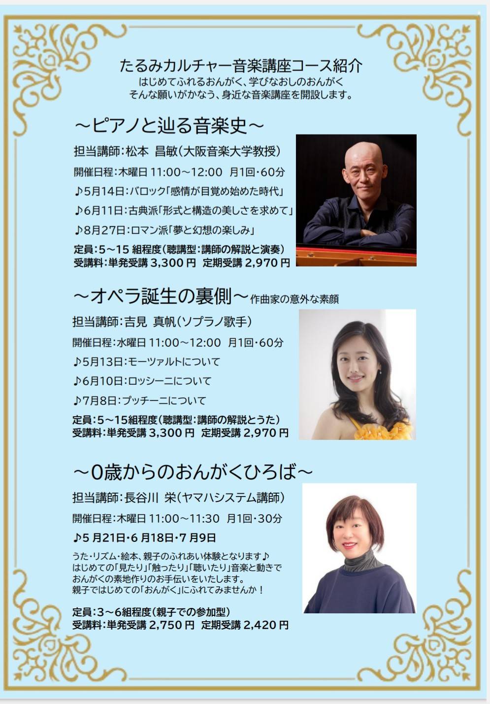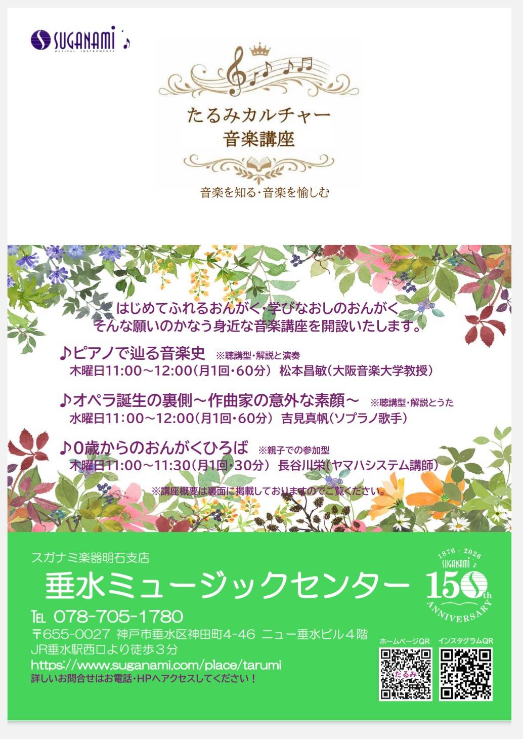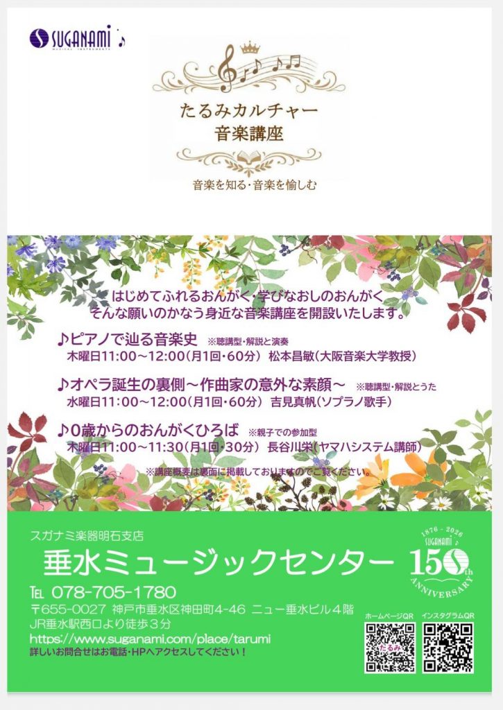 2026-02-07 update ♬たるみカルチャー音楽講座開設のお知らせ♪ 2026年5月より、「音楽を知る・音楽を愉しむ」をコンセプトに はじめてふれるおんがく、学びなおしのおんがく、そんな願いのかなう身近な音楽講座を開設いたします。 いずれのコースもどなたでも、年齢層も問わずご参加できる音楽講座です。 お問合せは垂水ミュージクセンターまでお問合せください♪ ℡078-705-1780 1 2 3 4 5 6 7 次へ