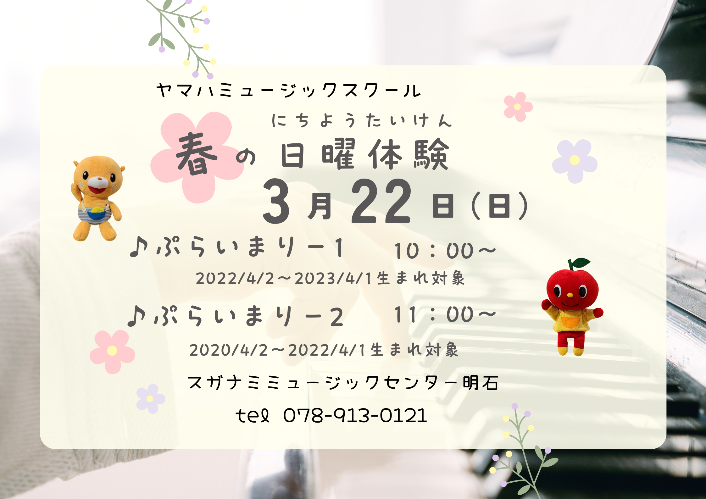2026-02-16 update 日曜体験レッスンの実施のお知らせ 日時 3月22日(日) ♪ぷらいまりー1 10:00~ 2022/4/2~2023/4/1生まれ対象 ♪ぷらいまりー2 11:00~ 2020/4/2~2022/4/1生まれ対象 お申し込みは スガナミミュージックセンター明石 TEL (078)913-0121 1 2 3 4 5 6 7 次へ