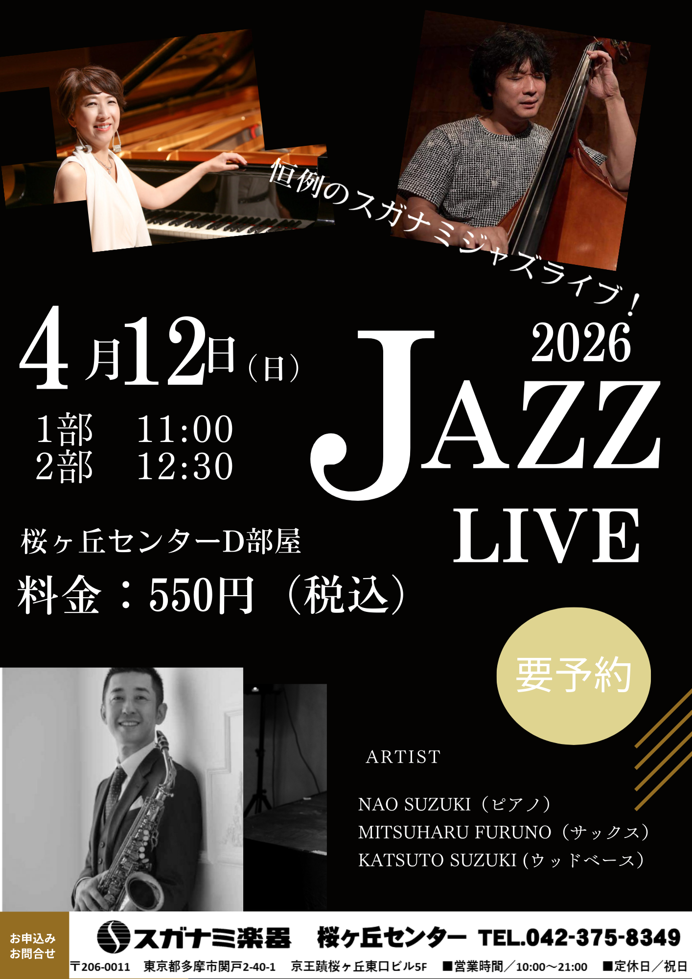 2026-03-12 update スガナミジャズライブ開催♪ 毎年恒例のスガナミジャズライブを4/12(日)に開催いたします! 場所:桜ヶ丘センター D部屋 第1部 11:00~ 第2部 12:30~ 料金:1人550円(税込) ご予約はお電話または受付まで。 ※当日のお支払いとなります スガナミの生徒さんはもちろん、生徒ではない方もご予約お待ちしております! 前へ 1 2 3 4 5 6 7 次へ