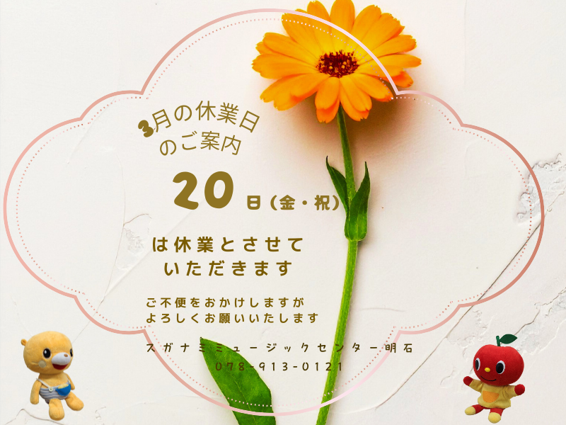 2026-03-18 update 3月の休業日のお知らせ 3月20日(金・祝)は休業とさせていただきます。 ※明石ショップもお休みです ご不便をおかけしますが、ご了承のほどよろしくお願いいたします。 スガナミミュージックセンター明石 TEL 078-913-0121 前へ 1 2 3 4 5 6 7 次へ