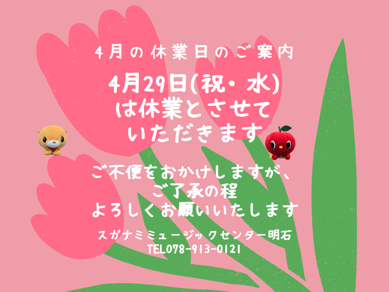 2026-04-01 update 4月の休業日のお知らせ 4月29日(祝・水)は休業とさせていただきます ご不便をおかけしますが、ご了承のほどよろしくお願いいたします。 スガナミミュージックセンター明石 TEL 078-913-0121 1 2 3 4 5 6 7 次へ