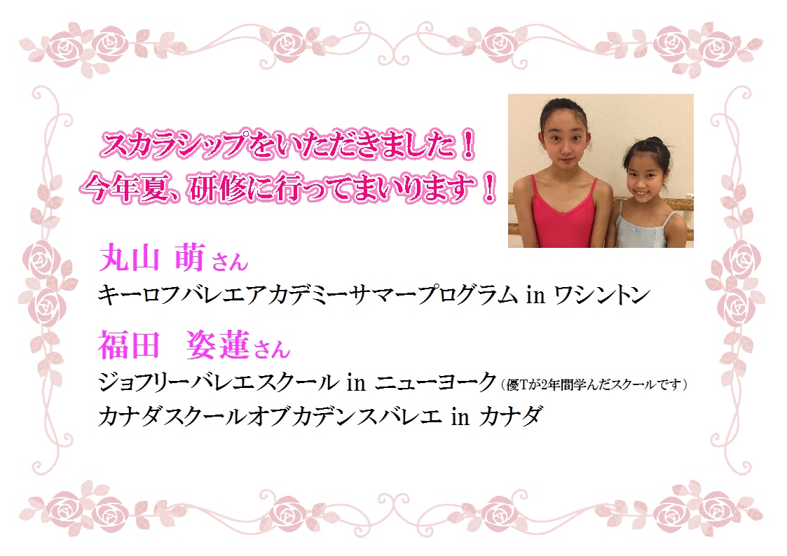 バレエスクールより2名がスカラシップで海外研修へ! 2015-03-26 update スガナミクラシカルバレエスクールの生徒さん2名がスカラシップを頂きました! 今年の夏、研修へ行ってまいります! 次へ