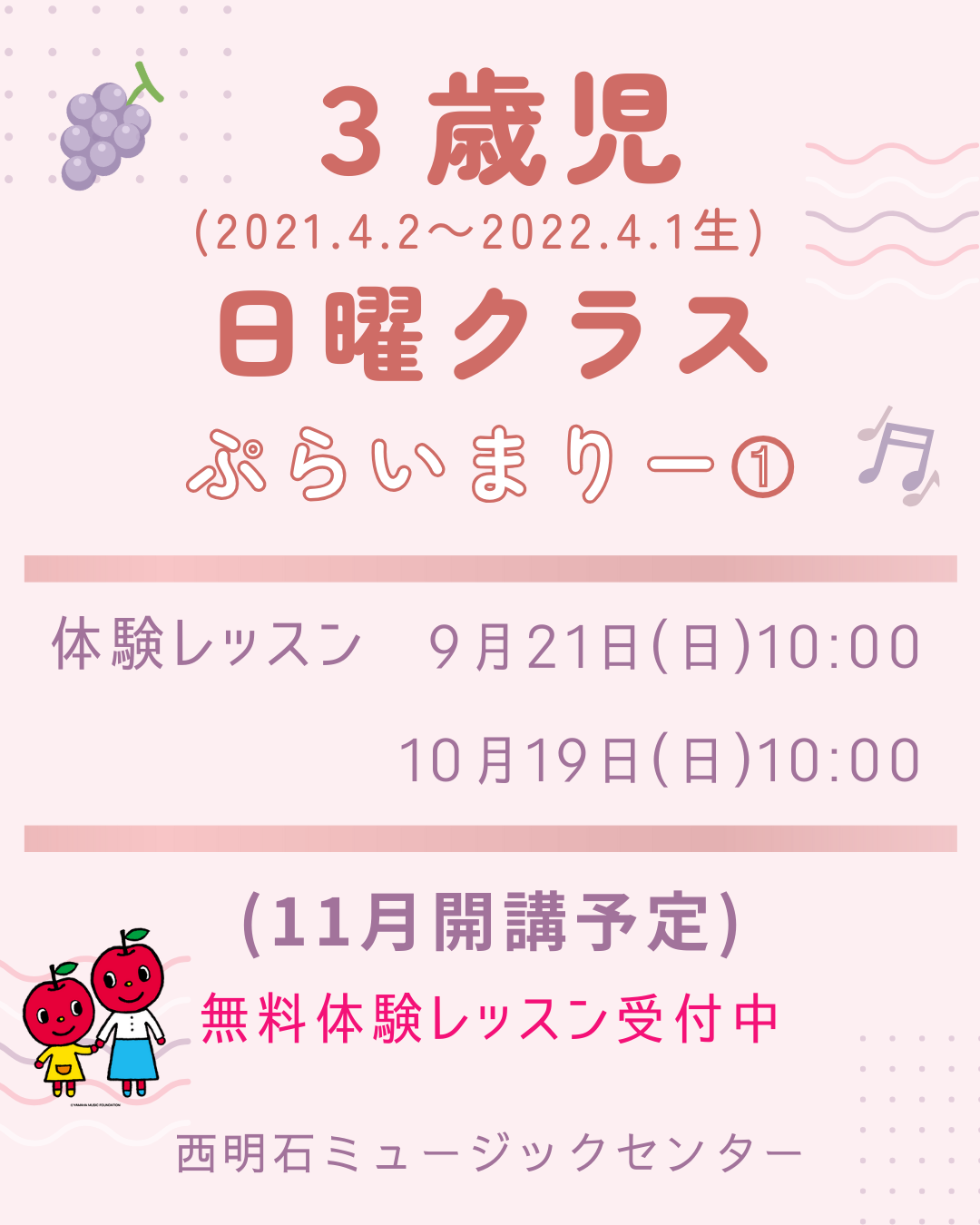 2025-09-04 update 11月新開講!日曜クラス3歳児のための”ぷらいまりー①”体験レッスン受付開始! 体験レッスン受付開始!! ♪3歳児のための ぷらいまりー1 【11月開講クラス】 日曜日 10:00 〈体験レッスン日〉 9月21日 (日) 10:00 10月19日 (日)10:00 ≪ぷらいまりー1 詳しくはこちら 無料体験レッスン受付中!! 西明石ミュージックセンター 電話:(078)929-0131 前へ 1 2 3 4 5 6 7 次へ