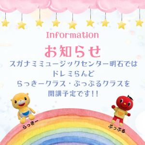 2024-05-07 update らっきークラス、ぷっぷるクラスを開講予定です スガナミミュージックセンター明石では らっきークラス、ぷっぷるクラスを開講予定です。 ☆らっきークラス 2022.4.2~2023.4.1生まれ対象 開講予定:水曜日 10:00 ☆ぷっぷるクラス 2021.4.1~2022.4.1生まれ対象 開講予定:水曜日 11:00 お申し込み・お問い合わせは スガナミミュージックセンター明石 TEL 078-913-0121 前へ 24 25 26 27 28 29 30 次へ