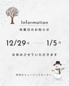 2025-12-03 update 年末年始の休業のお知らせ 平素は格別なお引き立てをいただき厚くお礼申し上げます。 誠に勝手ながら下記の通り年末年始の休業をさせていただきます。 【年末年始の休業日】 2025年12月29日(月)~2026年1月5日(月) 尚、1月6日(火)より通常営業いたします。 お客様にはご不便をお掛けいたしますが、何卒ご了承のほど宜しくお願いいたします。 スガナミ楽器 西明石ミュージックセンター 1 2 3 4 5 6 7 次へ