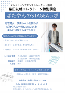 2025-09-04 update ※木曜日に変更になりました。柴田友輔エレクトーン特別講座《ばたやんのSTAGEAラボ》 老若男女 演奏レベル問わず、ばたやんと一緒にSTAGEAを楽しむ研究をしませんか? レッスン形態 月1回 45分/ 6,600円(税込み) 月1回 60分/ 8,800円(税込み) 開講曜日 木曜日 ※時間応相談 入会金 無料 まずはお試しレッスンへご参加ください ※お試しレッスン料 30分 3,300円(税込み) お申込み・お問い合わせは直接教室までお電話ください 西明石ミュージックセンタ- (078)929-0131 前へ 1 2 3 4 5 6 7 次へ