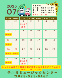 2025-07-01 update 7月営業日のお知らせ 7月は下記の通り営業いたします。 レッスンの都合で営業時間が変更になる場合がございます。 予めご了承ください。 スガナミ楽器 伊川谷ミュージックセンター ☎078-975-0467 前へ 3 4 5 6 7 8 9 次へ