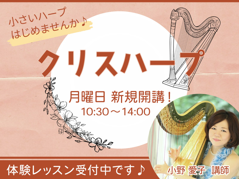 2025-09-06 update 小さいハープはじめませんか「クリスハープ」コースのお知らせ クリスハープは今話題の膝のせサイズの15弦レバーハープです。 お子様から大人の方まで、どなたでも手軽に楽しめるクリスハープ、ご興味のある方はお気軽に体験レッスンにご参加ください。 体験レッスン【事前予約制】 講師:小野 愛子(おの あいこ) 日程:9月22日、10月6日、20日(月曜日 10:00~14:00) 形態:個人レッスン(お一人30分) 体験レッスン参加料:1,100円(税込) 会場:スガナミミュージックサロン品川 詳しくはこちら 前へ 1 2 3 4 5 6 7 次へ