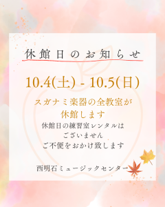 2025-09-18 update 休館日のお知らせ <休館日のお知らせ> 10月4日(土)・10月5日(日) スガナミ楽器全教室が休館します。 休館日の練習室のレンタルはございません。 ご不便をおかけ致します。 西明石ミュージックセンター TEL 078‐929-0131 1 2 3 4 5 6 7 次へ