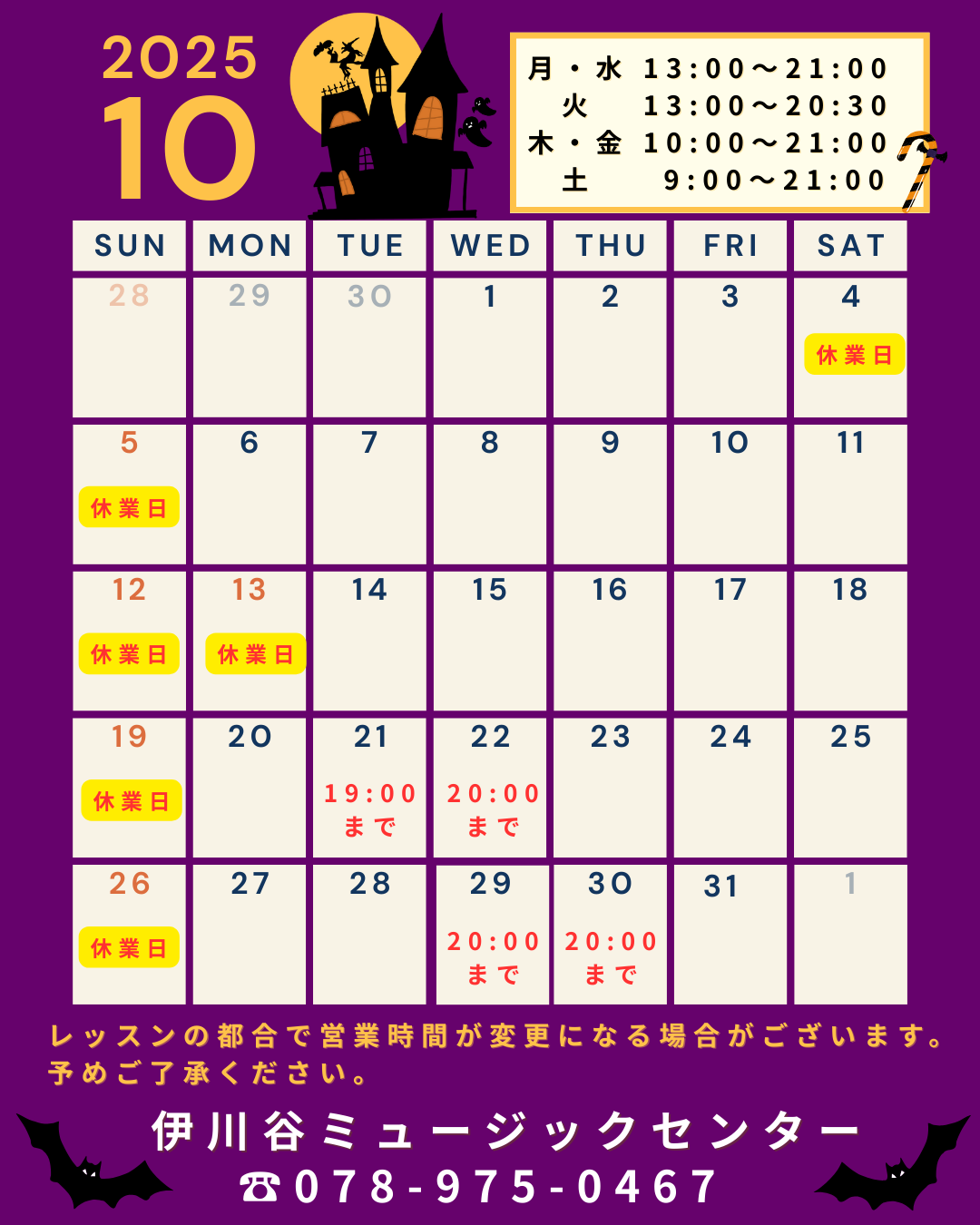 2025-09-29 update 10月営業のお知らせ 10月は、下記の通り営業いたします。 10月4日(土)、5日(日)は、全センター休業日となります。レンタルも不可となりますので予めご了承ください。 レッスンの都合で営業時間が急遽変更になる場合もございます。予めご了承ください。 また、午前中お越しになる際は、予めお電話頂けますと安心してお越し頂けます。 不明点等ございましたら、お気軽にお問い合わせください。 来月も宜しくお願いいたします スガナミ楽器 伊川谷ミュージックセンター ☎078-975-0467 1 2 3 4 5 6 7 次へ