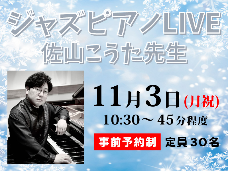 2025-10-04 update 佐山こうた講師によるジャズピアノLIVEのお知らせ 鶴川駅前センターで講師を講師をしている ジャズピアニスト 佐山こうた によるジャズピアノライブを開催します。 ワンコインで気軽に楽しめるので是非お申し込みください♪ 詳しくはこちら 1 2 3 4 5 6 7 次へ