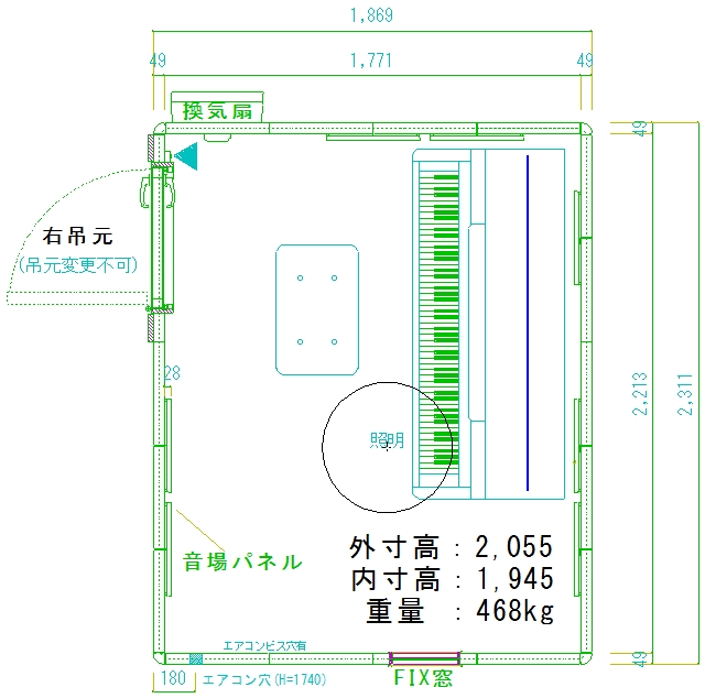 | サイズ | 外寸1,869mm×2,311mm×高さ2,055mm(内寸1,771mm×2,213mm×室内高1,945mm) |