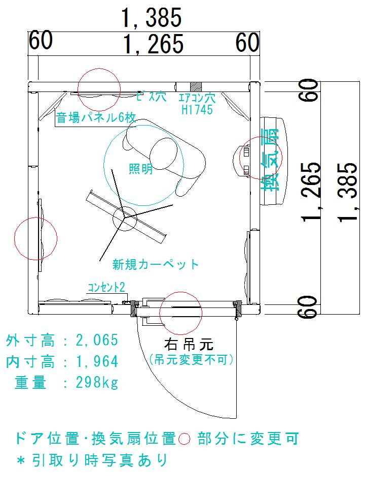 | サイズ | 外寸1,385mm×1,385mm×高さ2,065mm(内寸1,265mm×1,265mm×室内高1,964mm) |