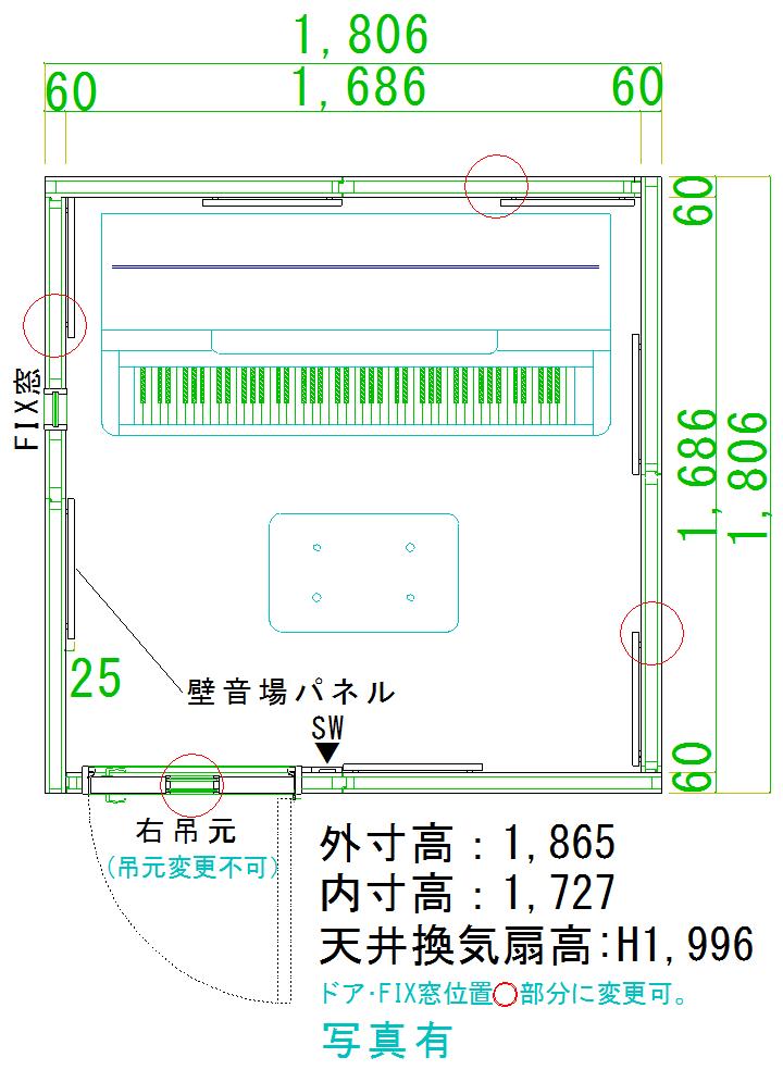 | サイズ | 外寸1,806mm×1,806mm×高さ1,865mm(内寸1,686mm×1,686mm×室内高1,727mm) |