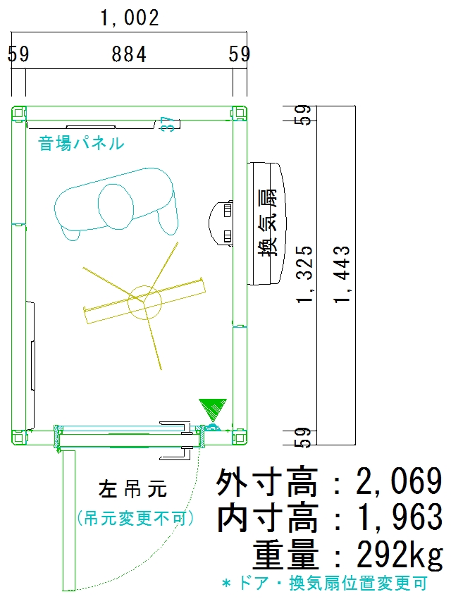 | サイズ | 外寸1,002mm×1,443mm×高さ2,069mm(内寸884mm×1,325mm×室内高1,963mm) |