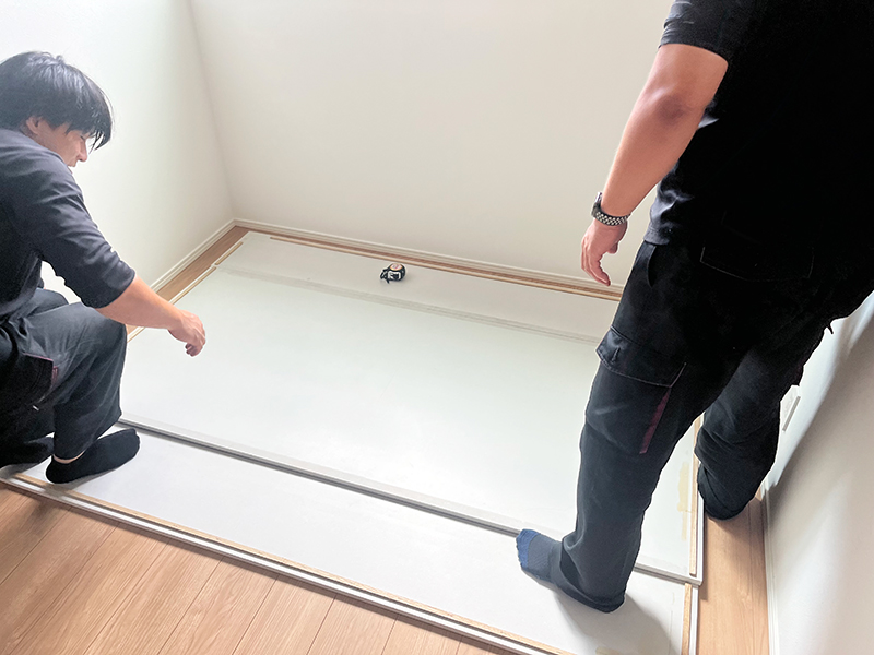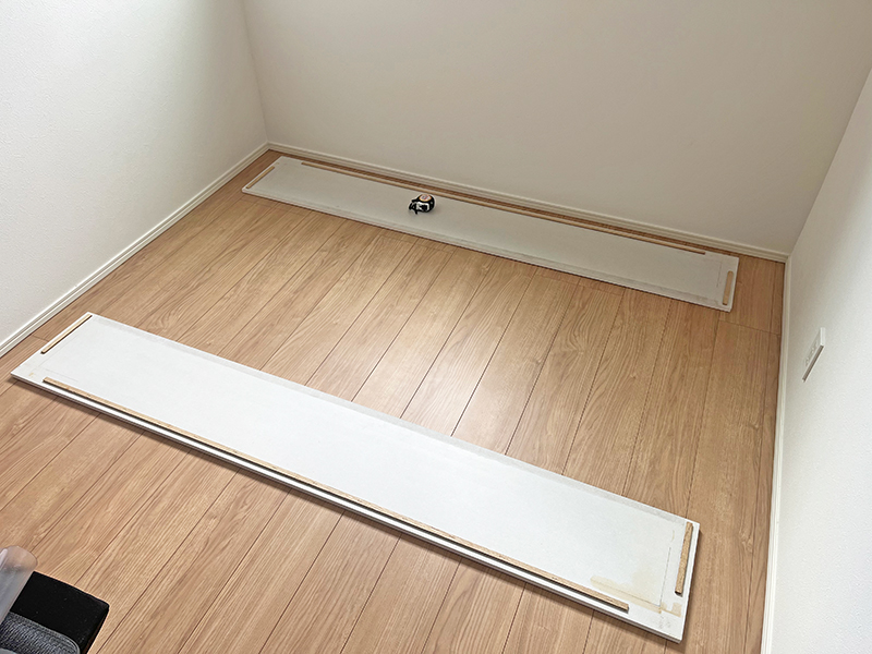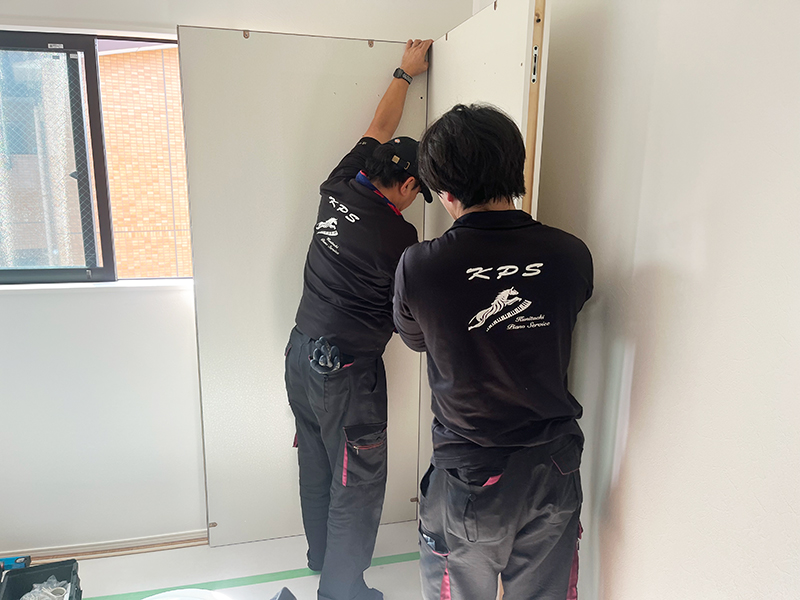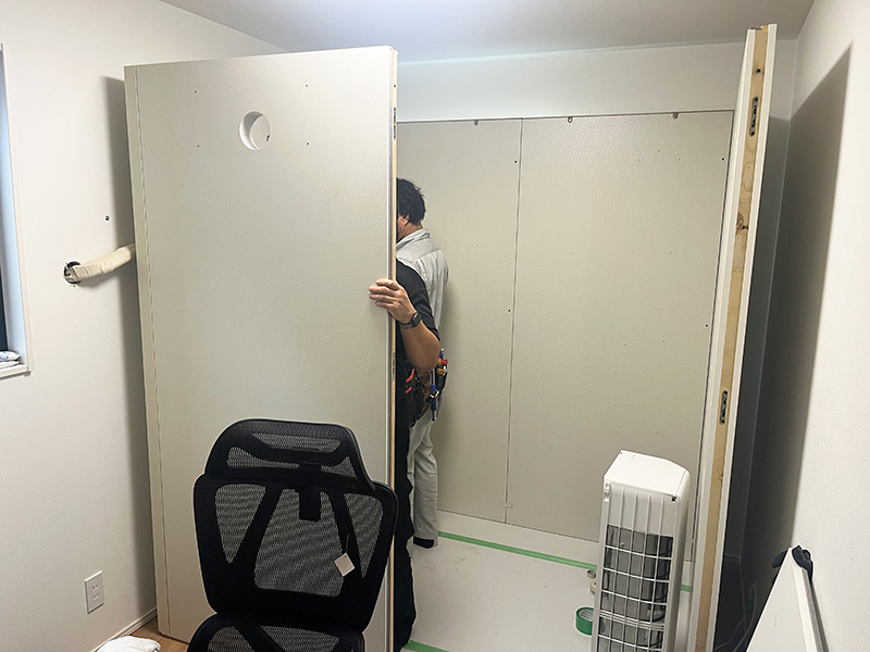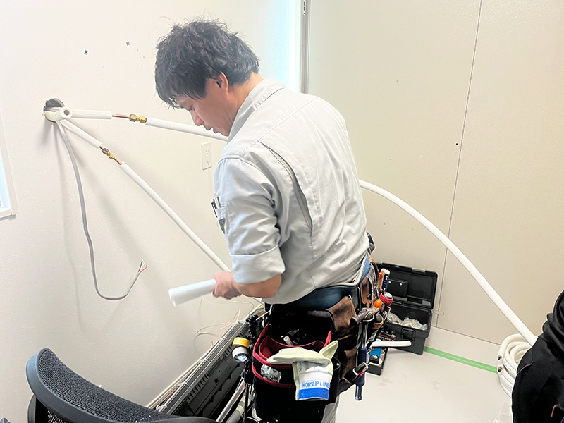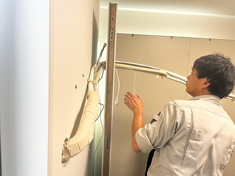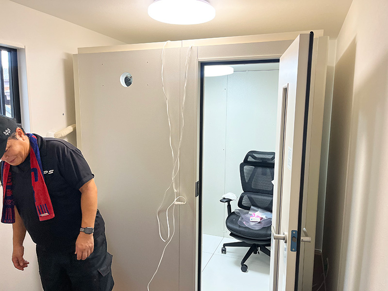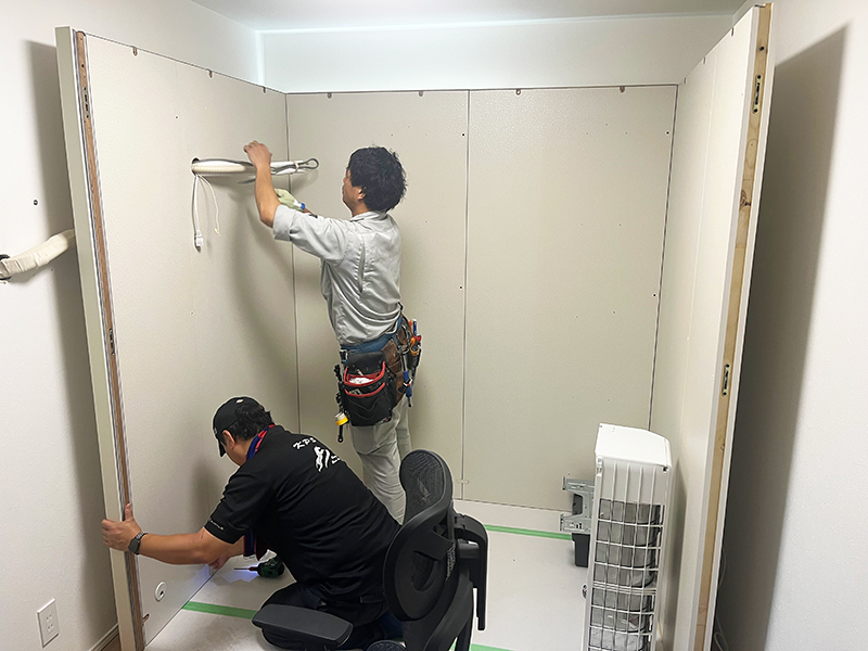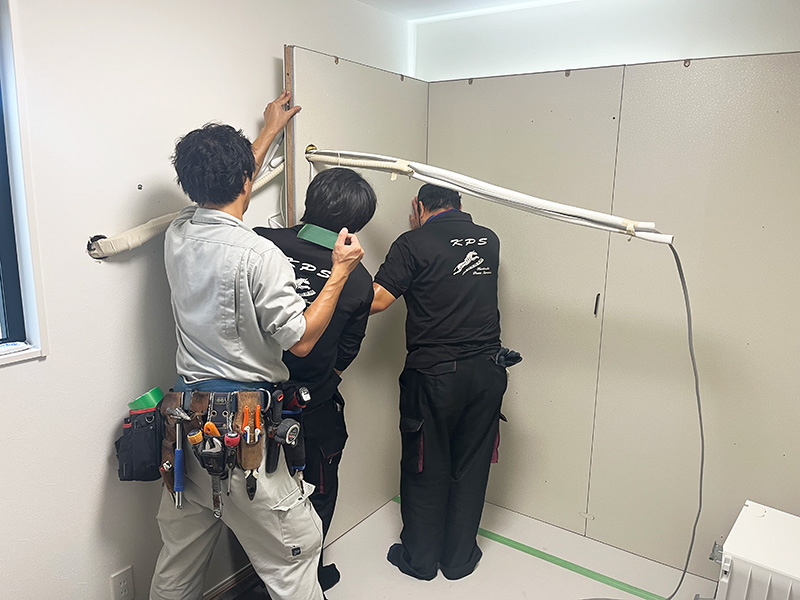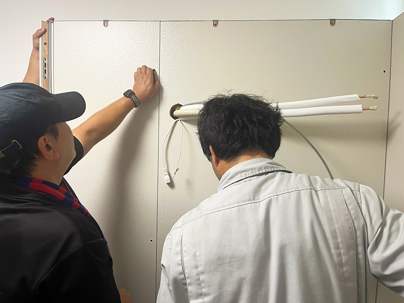 既存のエアコンを防音室内へ設置する為に、組み立てと同時作業でエアコン作業をしました。