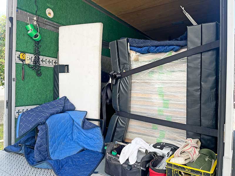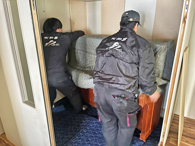 お持ちのアップライトピアノを引取り後、引越し先へ防音室と合わせて搬入しました。